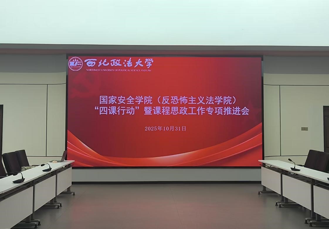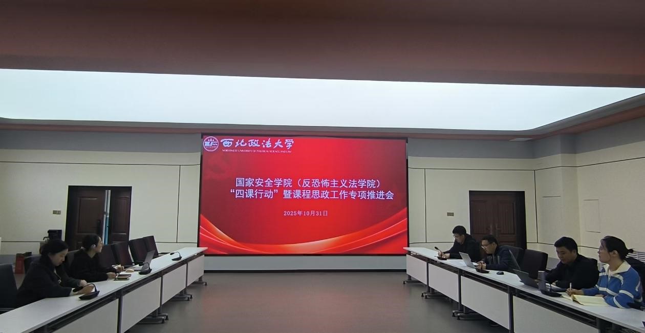 为进一步强化“三风”,提高“三率”,国家安全学院(反恐怖主义法学院)于10月31日在西北政法大学可视化中心开展“四课行动”暨课程思政工作专项推进会。学院党委副书记、副院长刘卫波、院长助理、国家安全战略(中华民族共同体)教研室主任段阳伟、国家安全思想与理论(国家安全法)教研室主任李明、国家安全治理(反恐怖主义法)教研室主任马瑜、教务秘书秦哲、本科年级辅导员张婕妮参加本次会议。会议由院长助理段阳伟主持。